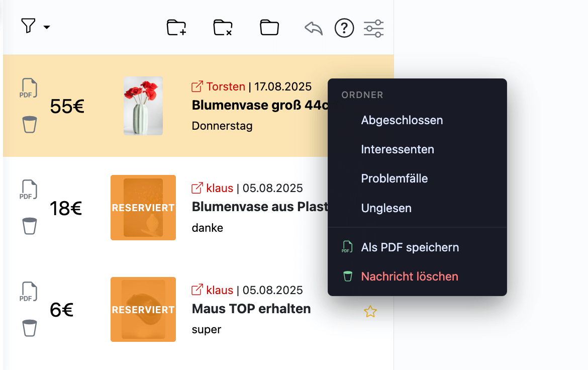 Mit der Ornderverwaltung für die Nachrichten im Kleinanzeigen-Enhanced Dashboard behältst du in deinem Postfach den Überblick und findest wichtige Konversationen in Sekunden.