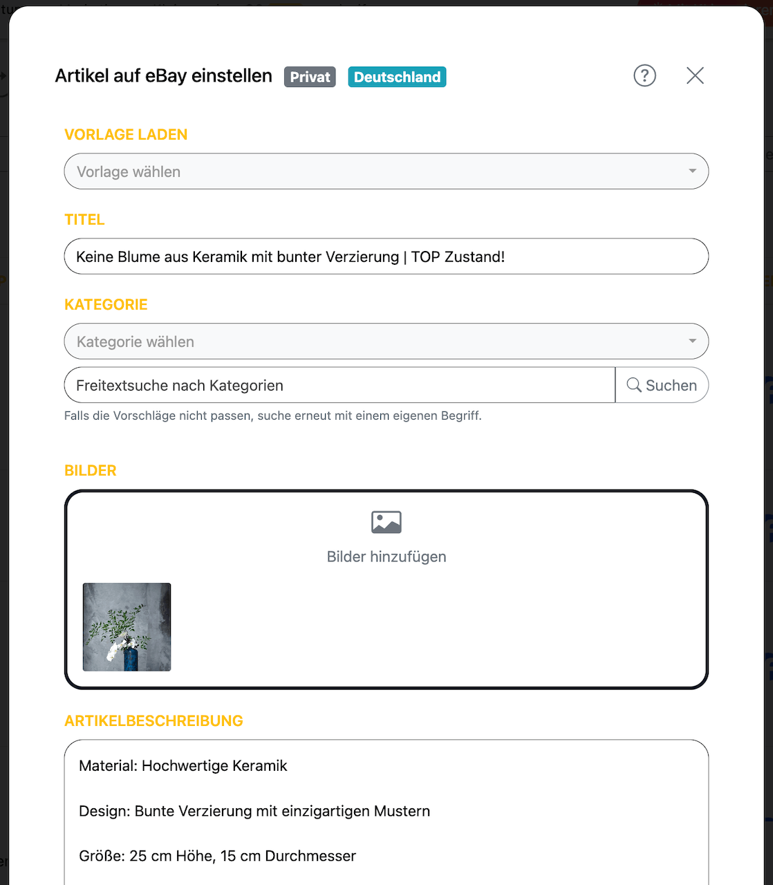 - Es öffnet sich nun ein Popup, wo du all die erforderlichen Daten für die Anzeige bei eBay ausfüllen musst. Wir übernehmen die meisten Felder automatisch aus der existierenden Anzeige.